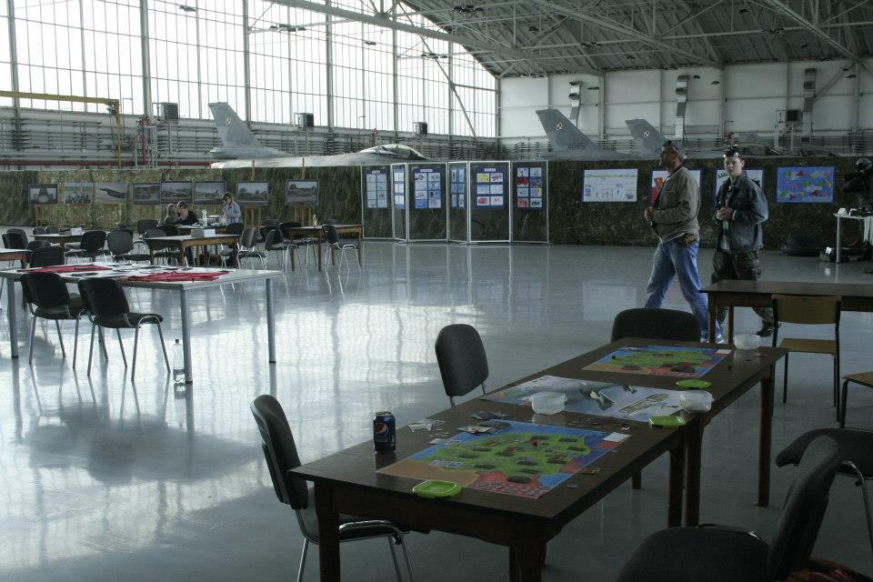 Prezentację gry Orły i Rakiety w hangarze ,31 Baza Lotnictwa Taktycznego Poznań-Krzesiny. W tle widać gotowe do lotu myśliwce F-16 Jastrząb.