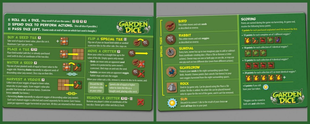 Garden Dice wyróżnia się wykonaniem i… klimatem! Wiem, to dziwne – wszak gra jest wysoce abstrakcyjna, ale jednak jej wykonanie powoduje, że człowiek myśli zarówno o wykiwaniu przeciwników jak i o – cóż – uprawie ogrodu. Kolejnym, wyróżniającym grę elementem jest pomieszanie interakcji pozytywnej z negatywną. Z jednej strony, podlewając i zbierając często wspomagamy innych graczy, którzy inteligentnie obstawili naszą grządkę swoimi warzywami. Z drugiej strony kafelek z ptakiem lub królikiem czasem puszczamy przeciwnikom „w szkodę”, pożerając ich nasiona lub warzywa.
