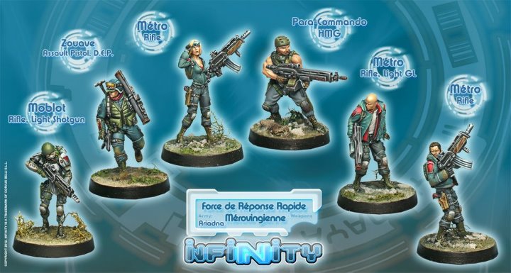 Na pierwszy ogień idzie najmniej „nowatorski” zestaw – Force de Réponse Rapide Mérovingienne – to starter do Francuskiej części Ariadny. Ariadna jest najbardziej zacofaną frakcją w świecie Infinity. Co nie znaczy, że jej armia jest słaba. Ten zestaw to solidna baza startowa dla Sił Szybkiego Reagowania Merowingów. W pudełku znajdziemy 3 żołnierzy podstawowej piechoty Metros, spadochroniarza uzbrojonego w CKM, oraz nowości zeszłego miesiąca – Żuława. Nowością jest model Moblot, czyli żołnierz francuskiej średniej piechoty, uzbrojony w karabin.