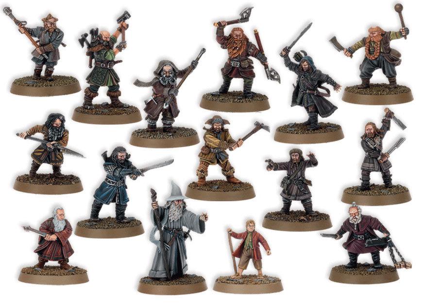 Po pierwsze, Gandalf Szary i Bilbo Baggins. Ten drugi dzierżący opcjonalnie, podróżną laskę lub Żądło. Do towarzystwa mają Thorina Dębową Tarczę i jego tuzin krasnoludów. Wszyscy po krasnoludzku wymachujący bronią i powiewający brodami. A każdy nieco inaczej.